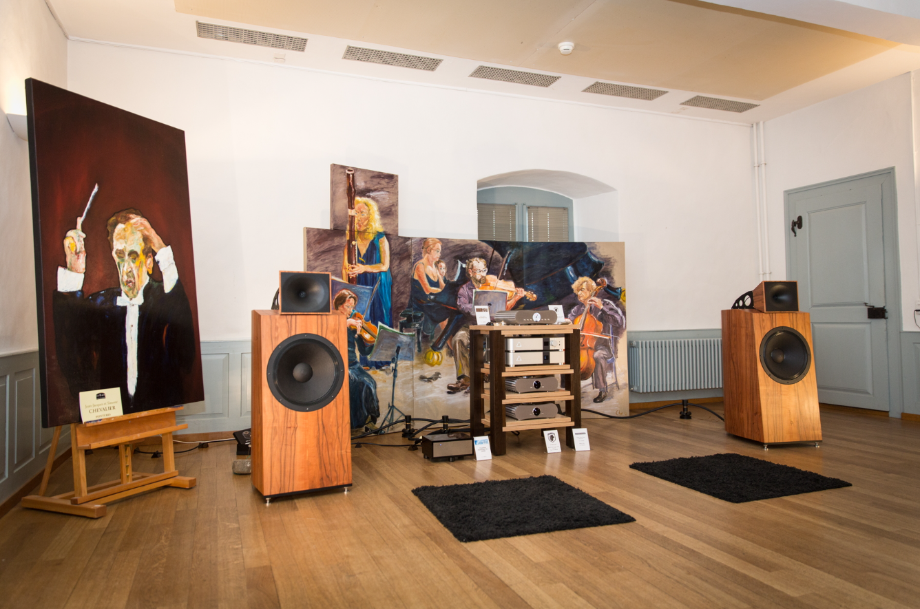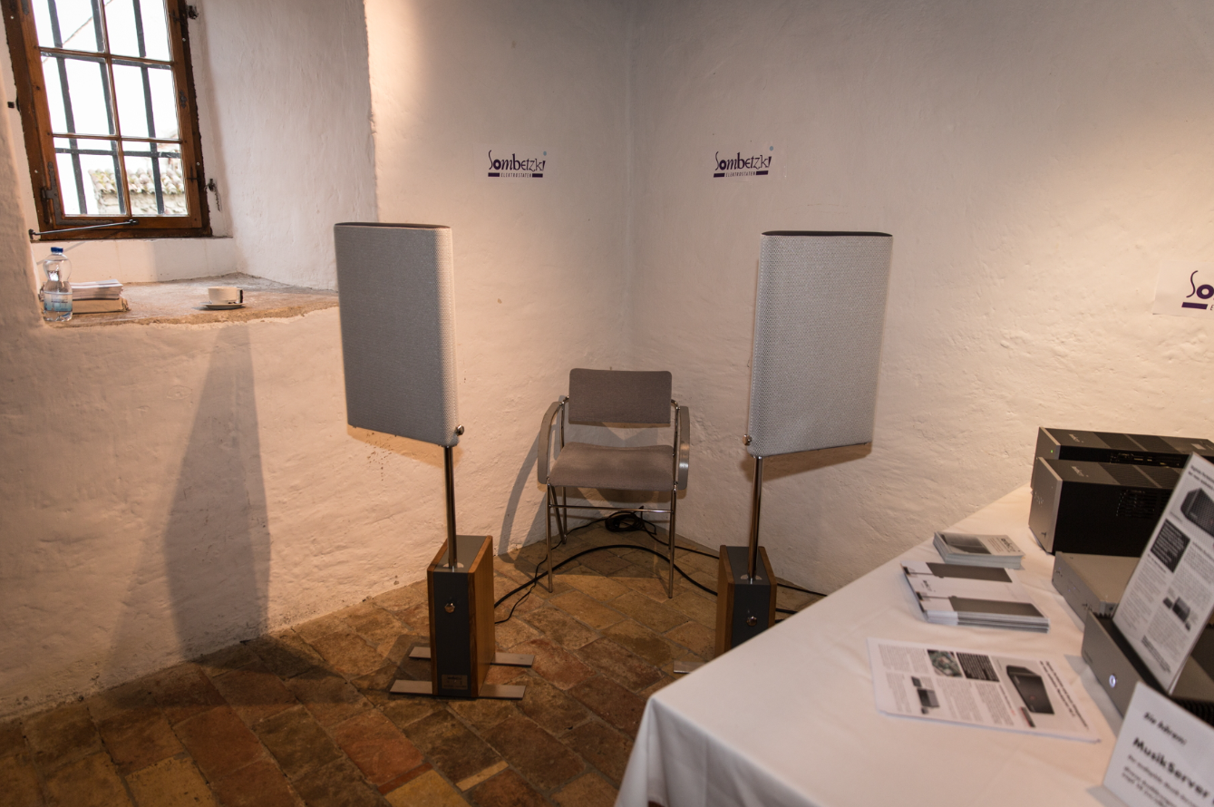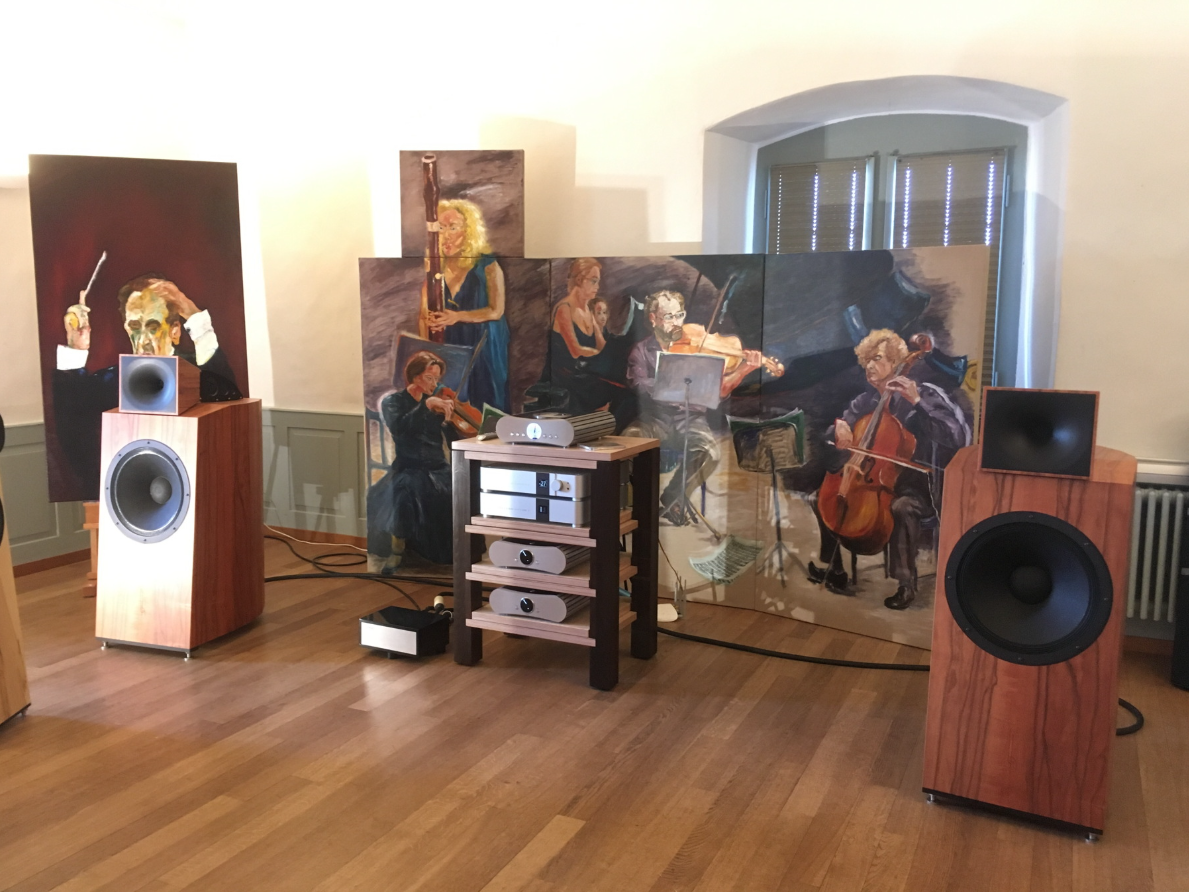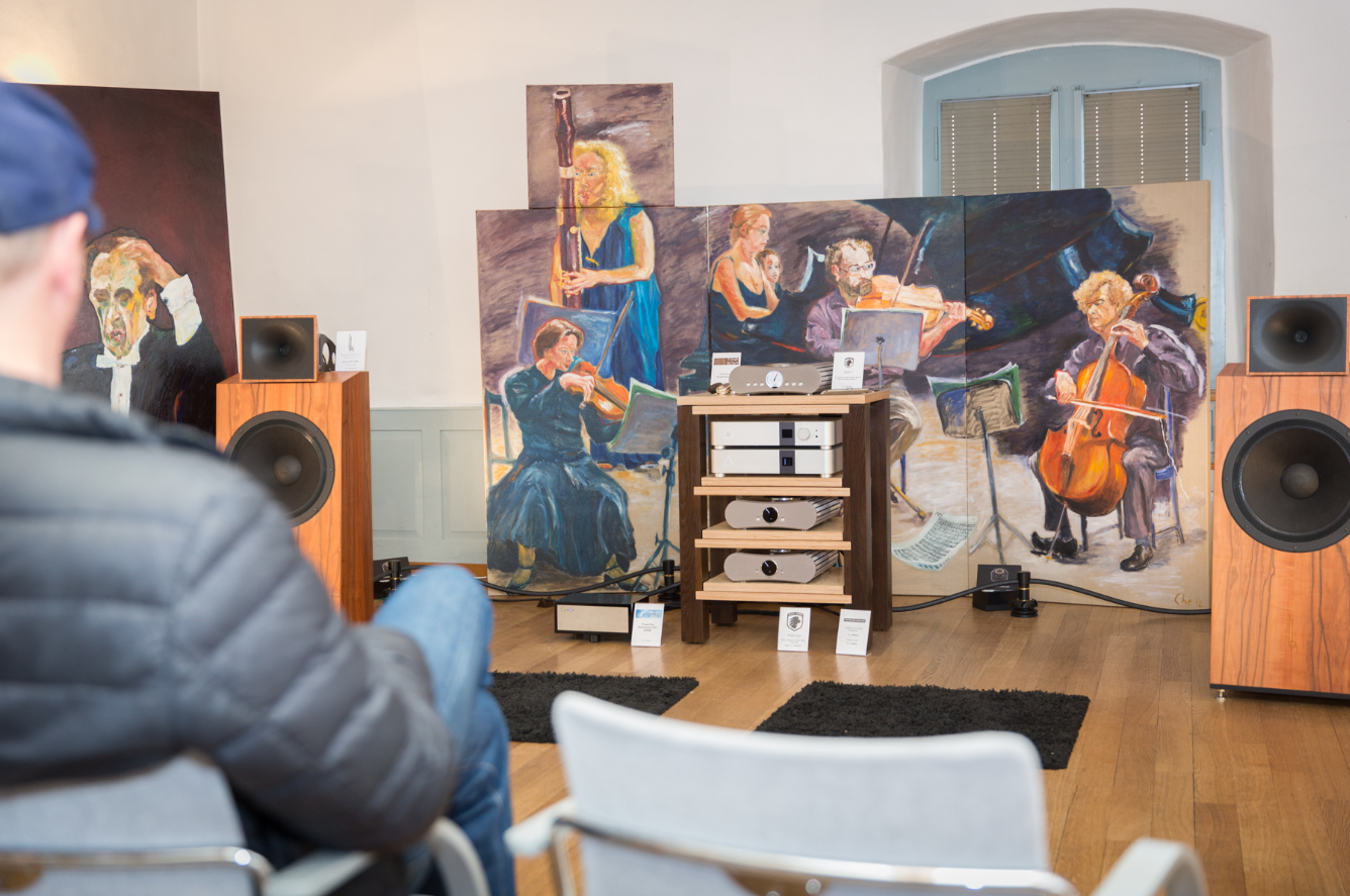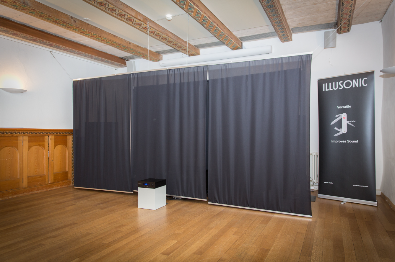 Der Hörraum war zweigeteilt: Wir teilten ihn mit Illusonic, einem Schweizer Unternehmen, das auf digitale Klangverarbeitung spezialisiert ist. Das entspricht nicht unserer Philosophie; es ist ein anderer Ansatz, der sich für viele Situationen eignet, in denen analoge Technologien nicht möglich sind. Sehr erfreulich.
